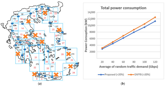 Figure 6, Figure 7, Figure 8 and Figure 9 depict the network used in the simulation, showcasing a chart presenting the total power consumption of the EAFFB algorithm [6] alongside the comparative results of the proposed algorithm for each of the four cases (>20%, >30%, >40%, and >50% earthquake occurrence probability thresholds). Critical regions, calculated by the algorithm, are marked with an orange “x” sign on the network maps for each case.