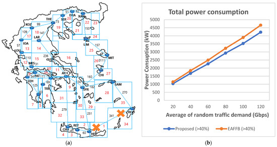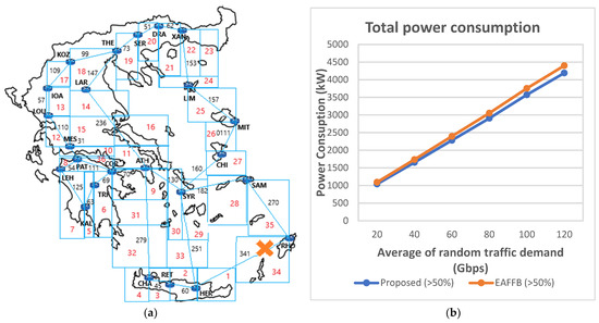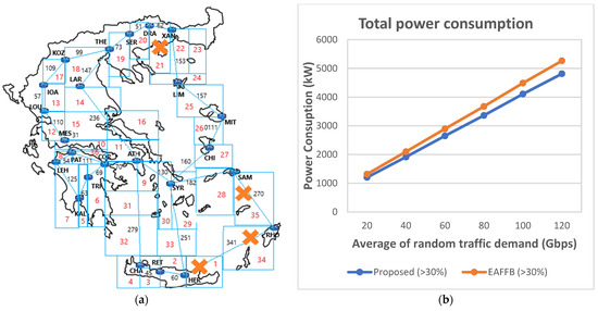 To estimate the overall power consumption of different design solutions, the network topology used in [6] was considered (Figure 5a). In detail, the network consisted of 24 nodes and 28 links, for each of which 2 directions will be considered, interconnecting the nodes, and forming a unified network. The network map was divided into 35 regions, calculating the probability of an occurrence of a future earthquake that could damage the links in each region.