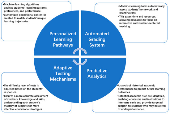 In the context of the aforementioned applications of ML in education, Figure 2 visually encapsulates the diverse and transformative roles that ML plays within the educational ecosystem. The diagram illustrates the flow from data processing to tailored educational interventions, encapsulating the multifaceted impact of machine learning on the educational experience.
