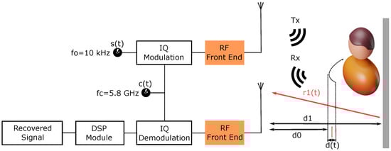 The Bio-Radar system employed in this research utilizes a Continuous Wave (CW) Doppler radar. As the terminology suggests, this type of radar continuously transmits a sinusoidal carrier wave, which is digitally generated, and captures the signal reflected by the target. Due to the micro-Doppler effect, a phase shift occurs when the subject’s chest wall moves towards or away from the radar, resulting in phase modulation in the received signal []. The Bio-Radar prototype used in this study, the operating principles of which are illustrated in Figure 1, was developed in a previous work [].