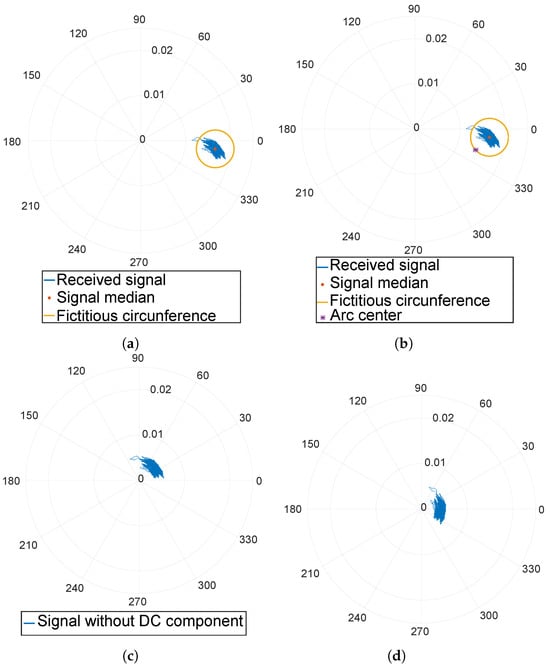 Sequential illustration of DC offset removal process in radar signal using the Optimized Cost Method. (a) Original radar signal with DC offset shown by ‘Received signal’ and the guide for optimization ‘Fictitious circumference’ with ‘Signal median’ as its center. (b) Identification of ‘Lowest cost point’ indicating the optimal DC offset values, with ‘Arc center’ marking the new median post-correction. (c) Signal post-DC offset removal, where the median aligns with the origin. (d) The signal after offset removal and a rotation to align for further analysis.
