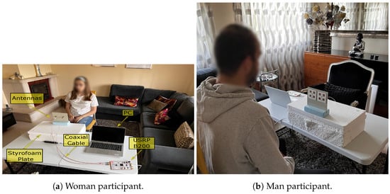 Given the absence of a public dataset encompassing a broad range of subjects’ stature variability, it was necessary for us to gather a substantial dataset of vital signs. This study received approval from the Ethics and Deontology Committee of the University of Aveiro, Portugal (No. 29-CED/2021), and was conducted in accordance with the Declaration of Helsinki. Informed consent was obtained from all participants. The data collection took place in a single unaltered environment: an 18 square meter room. The setup involved the Bio-Radar system described earlier, positioned on a plastic table. Styrofoam plates were utilized to adjust the height of the antennas to match the stature of the subject being tested. Figure 5 provides an example of the setup with two volunteers—a woman (Figure 5a) and a man (Figure 5b). The data collection involved 92 subjects (46 males and 46 females) aged between 18 and 50 years old with Body Mass Index (BMI) values ranging from 17.5 to 40 kg/m2 and Chest Wall Perimeter (CWP) measurements between 77 and 129.5 cm.