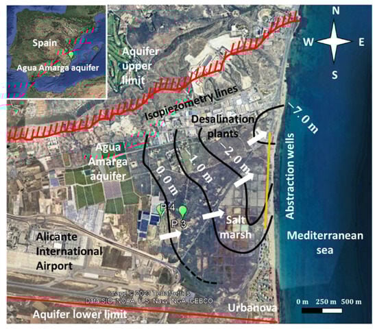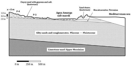 Figure 3 shows the aquifer location, its limits, and the position of the measurement wells, P-3 and P-4, separated by a distance of 300 m and far away from the salt marsh and the extraction wells of the desalination plants. The piezometric isolines derived from the aquifer control well network, also shown in Figure 3, allow us to ensure that the groundwater flow between the P-3 and P-4 boreholes is horizontal and directed towards the coastline. A thermal diffusivity of 3.6 × 10−6 m2/s has been estimated []. Figure 4 shows the geologic cross-section through the P-3 and P-4 well line to the sea. The aquifer, formed by an approximately 20 m thick layer of silty sands and conglomerates from the Pliocene–Pleistocene, is located under a thin layer of clayey mud with gypsum and salt (Quaternary). Beneath the aquifer, a limestone marl formation (Upper Messinian) acts as an impermeable barrier.