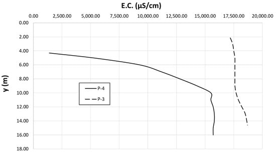 Since this is a coastal aquifer, it is necessary to investigate whether density-driven flows caused by concentration changes due to salinity changes produce fluid velocities comparable to the estimated velocity. The expression for these velocities is , with indicating the saltwater density changes, κ the intrinsic permeability, μ the dynamic viscosity and ε the porosity of the aquifer ( = 0.6) []. For calculations, Figure 6 shows the salinity-depth profiles of wells P-3 and P-4, measured in March 2019. Although this is a complex coastal aquifer, the salt concentrations in the aquifer caused by marine intrusion are negligible compared to the remaining concentrations caused by former salt mining, as shown in these curves.