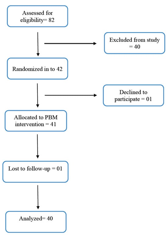 A flow diagram presenting the participant recruitment process is shown in Figure 1. Eighty-two edentulous patients with DS were assessed for eligibility for the study. Forty patients were excluded based on the exclusion criteria. One participant not willing to participate declined the invitation. Upon follow-up, one participant did not respond. Therefore, 40 participants were included in the study (27 males (67.5%) and 13 females (32.5%)). The mean age of the participants was 54.20± 15.39 years.