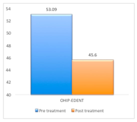 Pre- and post-treatment scores of OHIP-EDENT domains.