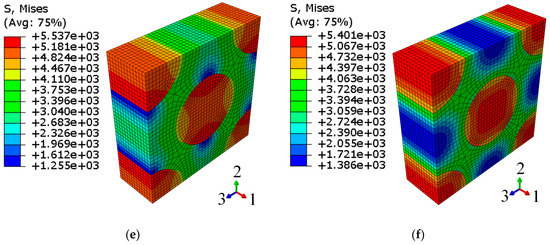 A microscale cell model, as depicted in Figure 2, was developed in ABAQUS for the predictive analysis. In this model, the fiber-reinforced phase is represented by the yellow region, while the resin matrix is indicated by the gray area, comprising a fiber volume fraction of 51%. The analysis involved constructing a finite element model of the microscale cell in ABAQUS, inputting material parameters for each component as listed in Table 1, specifying material orientations, and setting up a thermal stress analysis step. The mesh was created using C3D8R elements with a side length of 0.4 mm. A custom Fortran subroutine was developed to define specific variables, and binding contact techniques were applied to enforce periodic boundary conditions on the microscale cell. Computations were executed in ABAQUS, with Figure 3 illustrating the resultant equivalent stress distribution in the microscale cell under six distinct thermal stress scenarios. Figure 3a,b displays the tensile scenarios. Specifically, Figure 3a shows stretching along the fiber direction, with the fiber serving as the main load-bearing component. The stress levels in Figure 3b,c are nearly identical, with the primary distinction being a 90° rotation in the stress distribution around axis one, further validating the reliability of the thermal stress-based analysis method. Figure 3d–f illustrate shear conditions, whereas Figure 3d,e exhibits almost the same stress values, yet the stress distribution is rotated 90° around axis one. Post-calculation, a Python script was employed to extract the results, facilitating the determination of equivalent elastic properties for the microscale cell.