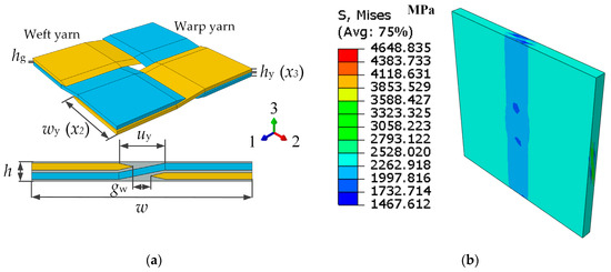 The plain weave mesoscale cell structure: (a) Plain weave mesoscale cell structure parameters; (b) Equivalent stress contour result of plain weave mesoscale cell structure.