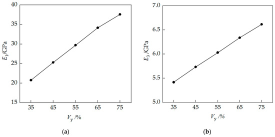 Carbon fiber woven composites are composed of fiber yarns and resin, as shown in Figure 6. The performance of each component greatly influences the overall properties of the composite material. To study the impact of fiber yarn volume fraction (Vy) in the mesoscale cells on the elastic parameters of the composite material, this section conducts an analysis of mesoscale cells with different fiber yarn volume fractions based on the prediction method described in Section 2.3.1. The results are presented in Figure 8.