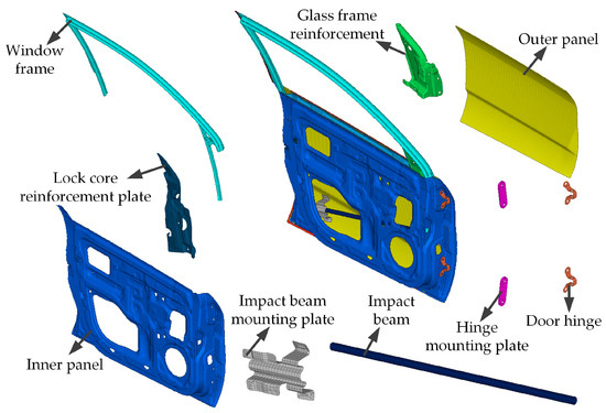 This paper selects a car door under development by a certain automotive manufacturer as the research subject. The car door system mainly comprises the window frame, lock core reinforcement plate, glass frame reinforcement, outer panel, inner panel, impact beam mounting plate, impact beam, hinge mounting plate, door hinge, etc., with each component illustrated in Figure 9. In the initial design, the total weight of the car door is 15.96 kg, with the inner panel weighing 6.12 kg, accounting for 38.34% of the total mass. This highlights the crucial role of lightweight design for the inner panel in the overall weight reduction of the car door system.