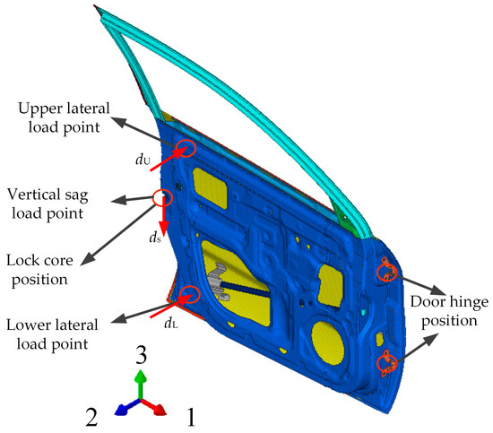 In the sagging condition, the hinges are constrained in all six degrees of freedom, while the lock core is constrained in the first and second directions, with a 900 N force applied in the third direction at the lock core position. The vertical displacement ds at the lock core position must be less than 4.5 mm. For upper torsional stiffness, the hinges are constrained in all six degrees of freedom, while the lock core is constrained in the first, second, and third directions, with a −900 N load applied in the second direction at a displacement of 50 mm below the window edge, and the upper-end displacement dU of the door must be less than 10 mm. In lower torsional stiffness, the hinges are constrained in all six degrees of freedom, while the lock core is constrained in the first, second, and third directions, with a −900 N load applied in the second direction at a distance of 50 mm above the door sideline, and the lower end displacement dL of the door must be less than 7 mm.