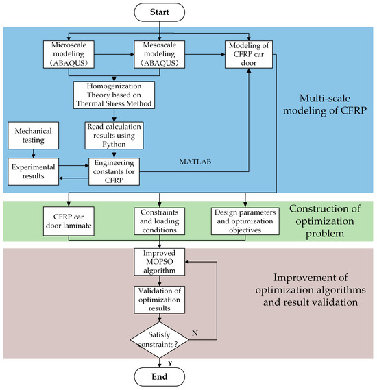 The development of advanced computational methods, such as optimization techniques and finite element analysis, has significantly improved the efficiency of engineering design [31,32]. Building upon this progress, this paper extends the multiscale material-structure integrated analysis method for carbon-fiber-reinforced plastics (CFRP), introduced in Section 2, to propose an integrated design method specifically for CFRP car doors, as illustrated in Figure 11. The approach involves