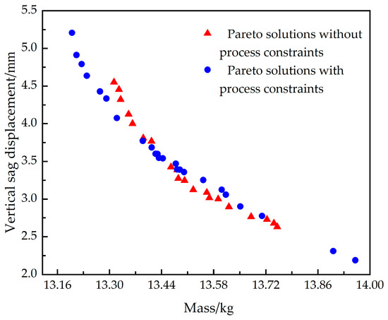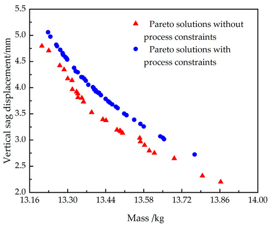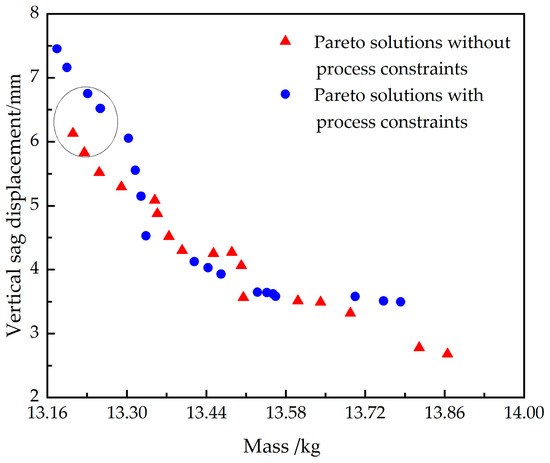 By applying the material-structure integrated optimization algorithm presented in Section 4, we successfully addressed the multiscale optimization design challenges for plain weave, twill, and satin weave composite car doors, considering both scenarios with and without process constraints. The converging Pareto solution sets are shown in Figure 12, Figure 13 and Figure 14 [33]. Overall, it is observed that the sagging stiffness and the mass of the CFRP car doors are two conflicting performance indicators. This means that if a solution with a lower door mass is selected from the solution set, it will inevitably have a larger sagging displacement, i.e., lower sagging stiffness, and vice versa. Furthermore, the solution sets considering process constraints and those not considering them show similar patterns of variation, but their distribution positions are significantly different. Specifically, the solution sets considering process constraints are mostly located in the upper right area of those not considering constraints, with this trend being most evident in the twill composite car door, as shown in Figure 13. The possible reason for this phenomenon is that when process constraints are considered, the feasible domain of design variables decreases. Some designs with lower mass and higher stiffness may not meet the layup process constraints of carbon fiber composites. Therefore, in the Pareto solution set, considering process constraints shifts the set towards the upper right, losing some performance indicators. To clarify this point further, the solution set within the circle in Figure 14 is examined: it was found that the solution set not considering process constraints includes layup designs with four consecutive layers at 0°, whereas the set considering process constraints, although slightly compromising on door mass and sagging stiffness, fully meets the requirements proposed in Section 4.1. In summary, although the performance parameters of the multiscale design of CFRP considering process constraints are slightly deteriorated, the solution set meets layup process requirements, avoiding design flaws due to poor layup design.
