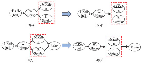Figure 2 is an example to clearly illustrate the Node-Composition Operator. From the process of subgraph expansion based on the meta structure in Figure 2, we can see that, in the second layer of subgraph expansion, we need expand two nodes of Person type at the same time from the node with Movie type. The process from 2(a) to 3(a) in Figure 2 shows the expansion from W.Horse (film) to M.Kahn (film editor) and S.Spielg (director). After the Node-Composition operation, we obtain subgraph (3)a’ in Figure 3. The relation connecting W.Horse (film) and composition node (M.Kahn (film editor) and S.Spielg (director)) is also adjusted to be a composition edge, which is revealed by the bold arrow in (3)a’ of Figure 3. Then, in the third layer expansion, it is the expansion from a composition node to a single node. As illustrated by the process from 3(a) to 4(a) in Figure 2, we generate subgraph expansion from M.Kahn and S.Spielg (a composition node) to E.Sun (a single node). After the operation of Node Composition, we obtain the subgraph exhibited by (4)a’ in Figure 3.