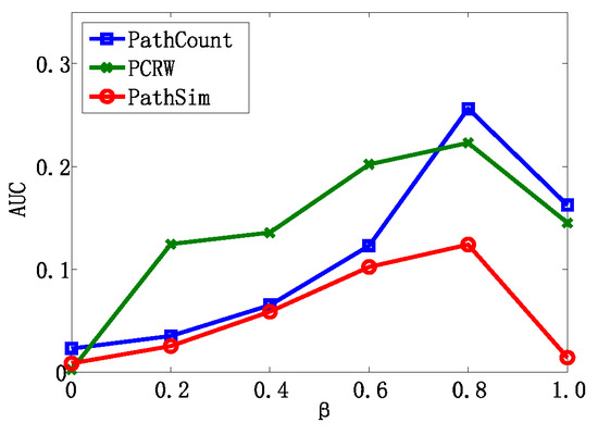 We also further studied how parameter β influenced the performance of algorithms in the entity resolution task. We varied the parameter β from 0 to 1 and recorded the AUC value, which is depicted in Figure 5. The experimental results on various β show that different weight combinations of the meta path have a significant effect on performance. With the increase in β, the performance first gradually increases and then decreases. Algorithms achieve the best AUC value when β = 0.8, which indicates that the meta path p1 has a more significant impact than p2 in the entity resolution task. This is also consistent with our intuition. In addition, it is very meaningful to determine the proper weight of the meta path so as to achieve a better performance, which will be studied in future work.