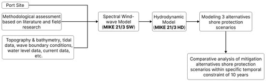 In Figure 1, a flowchart outlines the study methodology tailored to assess sediment transport conditions at the study site, considering the influence of wave direction [26]. The ultimate objective is to identify the most suitable protection alternatives to mitigate the occurring abrasion. The evaluation of this methodology encompasses the following sequential steps: