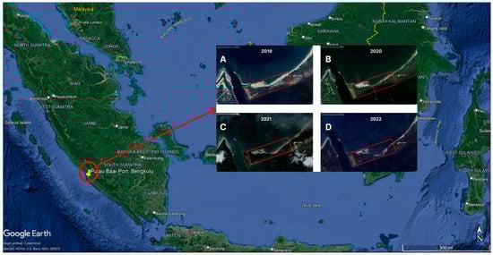 Research location and the comparison of the coastline over the past four years (A–D) around Pulau Baai Port, Bengkulu (Source: Google Earth Pro, 2022).