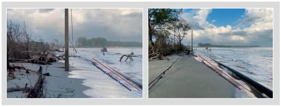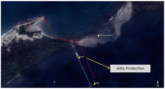 The research was conducted along the shoreline of Pulau Baai Port with coordinates ranging from a longitude of 102°16′00″ to 102°18′30″ east and latitude of 03°53′00″ to 03°55′30″ south, covering an outer water area of 2183.47 ha and an inner water area of 1000 ha [2,3,13]. As can be observed in Figure 2, it is evident that there has been a noticeable change in the coastline conditions at the study location from 2019 to 2022 (Figure 2A–D). Figure 2A shows that in 2019, a significant portion of the coastal land area was still present at the research site. However, in 2020 and 2021, as depicted in Figure 2B,C, it is apparent that the coastal land has begun to erode due to ongoing erosion, reaching its most severe condition, as indicated in Figure 2D. In this last image, the extent of coastal land has become severely limited, and it is on the verge of transforming into a fully aquatic region. These changes are attributed to the impact of strong waves, causing coastal erosion and abrasion [28,29]. This phenomenon has consequences for the submerged pipeline installations within the shoreline, leading to exposure to the external environment [27,30,31], as depicted in Figure 3. The image was captured during a site survey to assess the condition of existing pipeline installations.