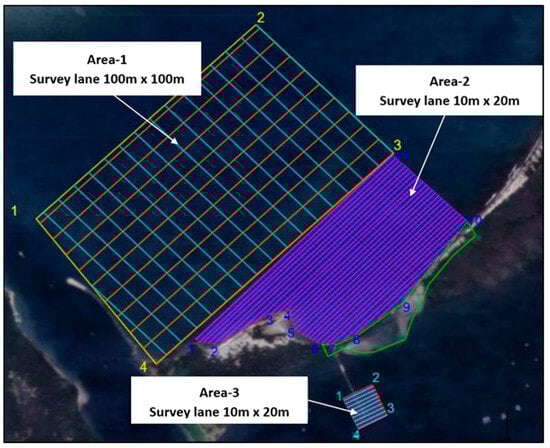 Sampling procedures were conducted using topographic, bathymetric, and metocean measurement methods. Bathymetric measurements were carried out to acquire data on the seabed surface profiles, employing a Single Beam Echo Sounder, an instrument utilizing sound waves for reflection off the water bottom [32,33]. The bathymetric survey was divided into three distinct areas, as depicted in Figure 4. This survey specifically targeted areas along the coastline that suffered severe erosion and locations frequented by ships, rather than covering the entire coastal region. Area-1, which encompasses the outermost zone measuring 1500 m × 930 m, featured survey lanes set at intervals of 100 m × 100 m. Moving to Area-2, which covered the outer region near the shoreline, it spanned a total area of 543,300 m2. In this area, the survey lanes were designed with a 10 m spacing along the main lane perpendicular to the shoreline and a 20 m spacing along lanes intersecting the main lane. Area-3 consisted of the bay/pool area with dimensions of 171 m × 156 m, and its lanes were configured with a 10 m spacing along the main lane perpendicular to the shoreline and a 20 m spacing along lanes intersecting the main lane.