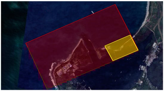 The input for the wave model employs a nesting model or a combination of models, integrating a larger area (denoted in red) with a smaller area (denoted in yellow) characterized by a higher grid resolution [43], as depicted in Figure 5. Simultaneously, Figure 6 presents bathymetric data obtained from surveys and global bathymetric data, which constitute essential inputs for the wave model.