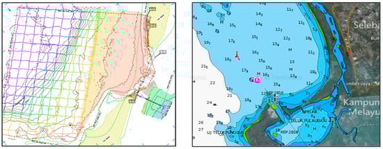 Bathymetric survey data (left) and global navionic bathymetric map (right).