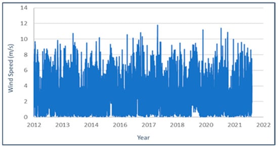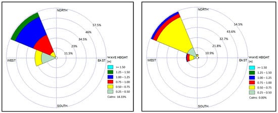 Graphical representations in Figure 7 show the data results for wave height (Hs), wave period (Ts), and wind speed spanning in Figure 8, where all the data were from 2012 to 2022. Subsequently, based on the depicted graph, a wave rose was generated using the ADCP survey method. The model’s validity was assessed through a comparison with the wave rose derived from the ECMWF wave model data, as illustrated in Figure 9. The findings reveal a similarity between the wave rose data from the model and the survey data at the same location and during the same month. Hence, it can be inferred that ECMWF data are well suited for incorporation as input for the wave model, which will be coupled with the sediment model to capture the abrasion processes occurring in the study area.