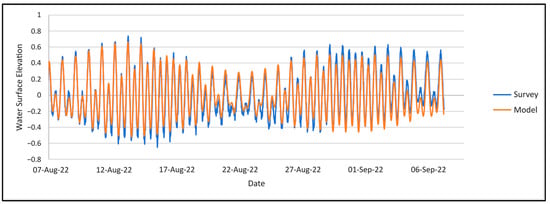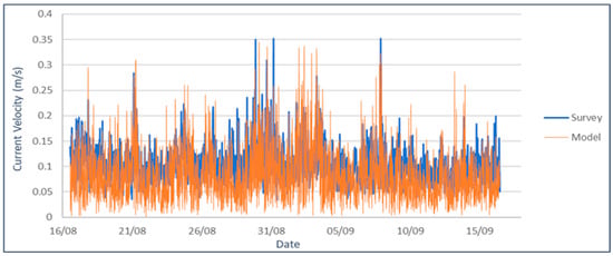 Shifting to the validation process for a single point of the current, the verification was conducted by considering both the direction and speed of the current. The simulated results for both components of the velocity exhibit patterns that align remarkably well with the observed data. This alignment is consistent with the expectations derived from the simulation outcomes. The overall patterns of the current speed and direction in the model closely resemble the observed values, showcasing a high degree of fidelity with an RMSE value of 0.05 m/s. The graphical representation of the velocity, comparing observational and modelled current speeds, is depicted in Figure 11. This graphical representation provides visual insight into the degree of agreement between the observed and simulated current velocities at the specified point. The primary reason for the greater dominant current survey velocity compared to the model’s is the larger amplitude of the dominant tide survey in contrast to the tide model’s amplitude. Moreover, differences in the wind parameters employed in the model input, as opposed to the actual wind parameters at the current survey location, could also contribute to these variations.