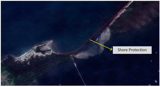 The simulation model encompasses three distinct alternatives. Alternative-1 employs shore protection extending over a length of 1200 m represented as a horizontal red line in Figure 12, while alternative-2 incorporates jetty protection spanning 650 m with the planning location indicated by a vertical red line in Figure 13. In contrast, alternative-3 represents a scenario with no shore protection. The integration of the current, wave, and sediment models allows for an assessment of the magnitude of abrasion within the study area over 5 and 10 years. These alternatives and their respective configurations are visually depicted in Figure 12 and Figure 13.