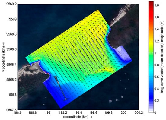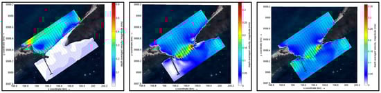 The highest waves observed in model-1 (Figure 18) reached 1.26 m and were located in the northeast region of the coast. In this first alternative, the area where ships dock is shielded from the impact of high waves from the north, due to the installed shore protection, and is exposed only to wave energy from the bay. This alternative shows the most effective mitigation measures in attenuating incoming waves and minimizing the risk of coastal erosion. Additionally, the presence of shore protection ensures that docked ships are still unaffected by wave surges, as the wave heights in the bay range only from 0.1 to 0.2 m. However, this alternative proves less cost-effective due to the substantial budget required for the construction of shore protection spanning 1200 m.