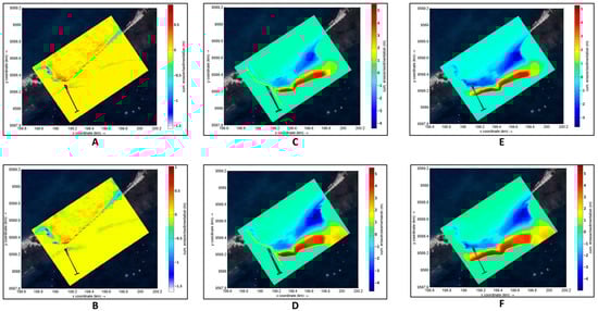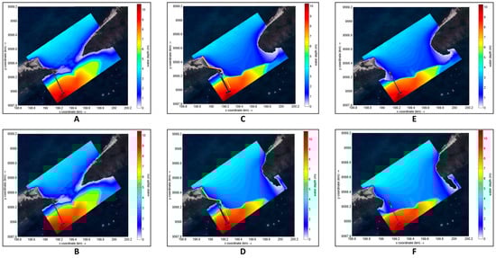 Morphological change model over 5 year (A,C,E) and 10 year (B,D,F) within coastal area ((A,B) represents alternative-1; (C,D) represents alternative-2; (E,F) represents alternative-3).