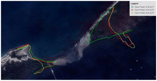 The bathymetric and coastline conditions over 5 and 10 years in alternative-1 show no significant changes due to the protection provided by the shore protection, effectively mitigating coastal erosion, as depicted in Figure 16A,B. In alternative-2, as shown in Figure 16C,D, the bathymetric and coastline conditions in the channel area exhibit no significant changes, indicating a stable or equilibrium condition. However, outside the planned jetty protection area, erosion occurs, transforming the area into open water. In this alternative, the most substantial erosion occurs on the eastern coastline, resulting in a notable change in the coastline. The bathymetric simulation results for alternative-3 in Figure 16E,F reveal changes in bathymetry after 5 and 10 years in the jetty area, pipeline area, and channel area due to severe erosion in the absence of shore protection. This leads to changes in the coastline and the conversion of affected areas into open water. An overlay of the coastline change models at the study location over a 10-year period was conducted to observe the differences in changes for each alternative, as depicted in Figure 17. In the figure, the green line stands for the coastline condition for alternative-1, the red line represents the coastline for alternative-2, and the yellow line symbolizes the coastline condition for alternative-3. From the overlay results, the most significant coastline changes occur on the eastern side for alternatives-2 and -3.
