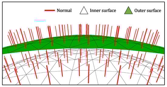 The surface of a precise mesh is composed of numerous small faces (hereafter the face is denoted as f, the faces are denoted as f′s, and the set of faces is denoted as F). Considering this, f is sliced so that every edge is smaller than the threshold (hereafter the edge is denoted as e, and the set of edges is denoted as E). In this paper, 1% of the mesh scale expressed in the norm was arbitrarily used for the value to be sufficiently precise relative to the overall mesh scale, as expressed in Equation (1).