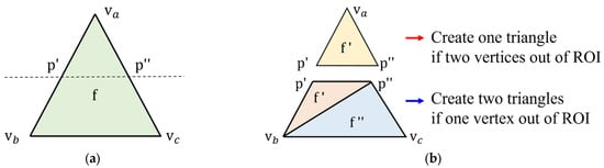 If the vertical value (generally y) of all v′s constituting is within the ROI, is maintained. Otherwise, is removed and new f′s are created using v′s within the ROI and positions () at the boundary, as shown in Figure 4a. The creation of new f′s depends on the number of v′s outside the ROI, as shown in Figure 4b. After removing the unused v′s, the preprocessing is complete.