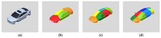 To compensate for the randomness of this method, K-means++ is used. This method ensures that the centers of the initial clusters are the farthest away from each other, resulting in a more even division. Clustering is performed using V, and the cluster of specific is determined to be the highest percentage cluster in the three v′s that constitutes it. Figure 5 shows the segmentation result using K-Means++ after preprocessing on a specific virtual large object (a car model).