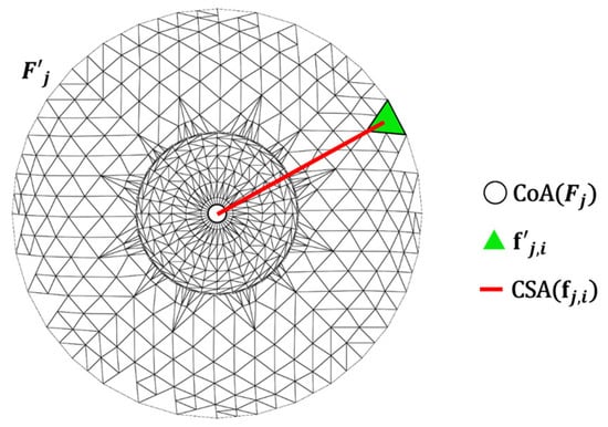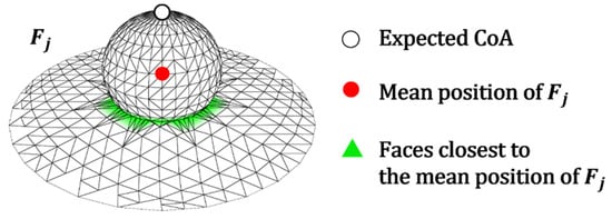 From Hypothesis 1, the specific i th f in the j th area among the segmented areas (hereafter this f is denoted as ) is placed more evenly as it is closer to the j th CoA, making it an appropriate candidate. But the f′s in the j th area (hereafter the set of these f′s is denoted as ) have three-dimensional geometric information, the mean position of may not represent the CoA. For example, if is shaped like a sphere convexly protruding from a circular plane, as shown in Figure 6, the CoA is expected to be the top of the sphere. However, the mean position of is located below the center of the sphere. As a result, the f closest to this position is not the closest to the expected CoA.