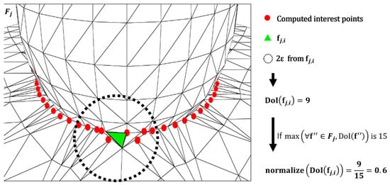 The 3D interest points are characteristic positions extracted from the three-dimensional geometric information of the mesh (hereafter 3D interest point is referred to as interest point). There are various methods for extracting interest points [21,22,23], most of them extract partial features by analyzing the overall geometry of the mesh. This means that if interest points are extracted from a large object, various features may not be reflected from the perspective of the segmented area.