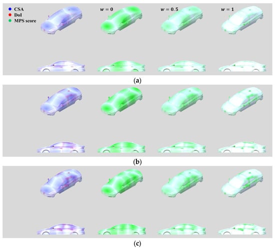 In Figure 10, green color indicates a high MPS score, and white color indicates a low MPS score. When no weights are considered (w = 0, second column in Figure 10a–c), it is shown that the closer to the CoA of each segmented area, the higher the MPS score, and the further away from the CoA, the lower the MPS score. On the other hand, when only the weights are considered (w = 1, fourth column in Figure 10a–c), the featured positions of each segmented region have higher MPS scores regardless of the CoA, and lower MPS scores otherwise. It is also shown that the number of segments (k) affects the MPS score because the segmented areas and CoAs are changed by k.