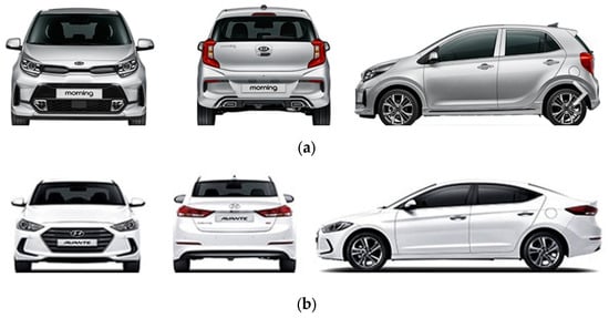 In the experiments, cars, which are commonly seen in everyday life, were used as large objects. Two types of cars with different sizes were used as large objects, as shown in Figure 12: Kia-Morning (=Picanto) 3rd generation 1st facelift (hereafter DM) and Hyundai-Avante 6th generation early model (hereafter DA). The specifications for each real object are listed in Table 3.