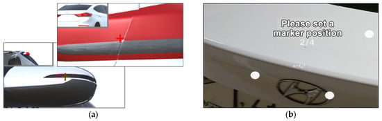 However, studies on applying multiple markers to a large object are still insufficient [5,14,15]. Boonbrahm et al. (2020) proposed a method to reliably augment a large object using multiple markers for remote collaboration [5]. In the proposed method, five markers were used to augment a large object, but the registration aspect was not considered because it was augmented in an actual box that was not related to the actual object to be registered. Bruno et al. (2020) developed and proposed an AR system based on multiple markers. In the proposed method, multiple markers were placed 1.5 m apart around the perimeter of a large object. However, in this study, the registration was performed again each time a marker was tracked, so it was considered a single marker-based registration [14]. Sheng et al. (2023) proposed a method for 3D scanning actual a large object using AR head-mounted display. Although a virtual object was not augmented in the proposed method, multiple markers were used for stable scanning. The markers were placed around the edge of the actual object, and the distance between them was set to about 25 cm [15].