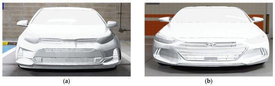As virtual objects, 3D models identical to the car models (e.g., Kia-Picanto 3rd generation 1st facelift) of the real objects were used [35,36]. To verify the equivalence of the virtual models to the real objects, it was checked whether they met the tolerances in Article 115 “Tolerance of Specifications” of the “MOLIT Ordinance: Regulations for Performance and Safety Standards of Motor Vehicle and Vehicle Parts”.