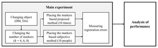 In the performance comparison analysis of the proposed method using the number of markers, as in results of previous studies, the error decreased significantly as the number of markers increased. However, a significant reduction in the specific object DA was not observed. This means that the using only four markers in DA is no different than using six or eight, so it is not necessary to use many markers; and this result means that there may be an optimal number of markers depending on the geometry of a specific model.
