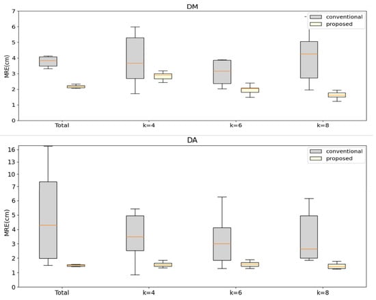 An analysis was performed to confirm whether the proposed method significantly reduced the MRE compared with the conventional method. The total MRE, which included the models (DM and DA), number of markers, and number of iterations, was used to confirm the normal distribution of the MRE for each method. The results of the Shapiro–Wilk test for the total MRE for each method are listed in Table 9 (with a 95% confidence interval), and it was confirmed that the normal distribution was not valid.