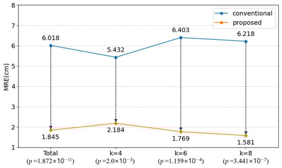 Therefore, the non-parametric Mann–Whitney U test was performed to confirm significant differences between the two groups (with a 95% confidence interval). This test confirmed that the proposed method had a significantly lower MRE than the conventional method, regardless of the number of markers. Figure 26 shows the mean differences and significance intervals between the conventional and the proposed methods.