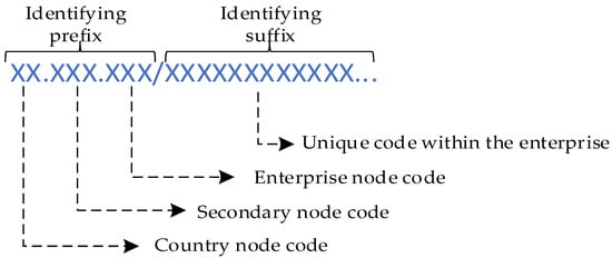 Identity coding is a technology that gives an object a digital identity, similar to the ID number in the “ID card”, which can identify physical resources such as materials, equipment, and products, and virtual resources such as production processes, data, algorithms, and models. The application basis of identification traceability is identification coding, and it is also the basis for quality traceability at the end user’s entrance. Therefore, when the product is connected with the production and the application systems, the identification coding rules should be unified first. According to the coding specification of the Alliance of Industrial Internet (AII) [20] and the “Handle” system, the unique code in the original production system of an enterprise and the enterprise prefix are used as the industrial code to establish the IIoT identification coding rules. Figure 1 shows the Handle identification code composition.