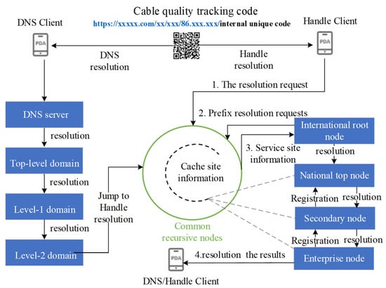 The enterprise user applies to the secondary node to register the Handle’s prefix, and at the same time, according to the realization of the agreement in the system, saves the fixed prefix and fixed link part of the enterprise, according to the set rules for code generation. Identity data need to synchronize basic data (product information and dealer data) and dynamic data (identity registration, identity update, in/out flow data). By docking the logistics identification data, distributor data, warehouse in/out data, and distributor in/out data with the production system, we can view the flow information of each logistics identification and its current state in the application system [28,29]. The cable quality traceability process with the integration of identity resolution and the blockchain is shown in Figure 10.