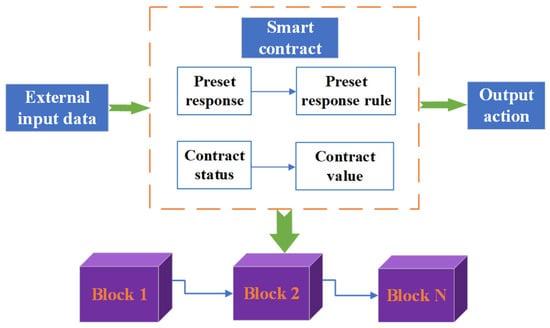 The smart contract is a kind of contract that can be automatically executed on the blockchain and written in the form of code. Smart contracts can realize various functions such as transferring money, verifying identity, and creating digital identity [22]. Smart contracts do not have a centralized control body, and their execution results are jointly verified by all nodes on the blockchain, which ensures fair and transparent transactions. Smart contracts play a role on the blockchain as shown in Figure 4.