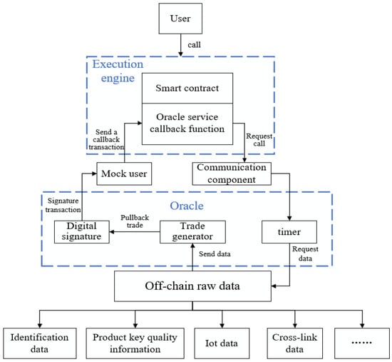 Middleware for Blockchain and IIoT is a key link in the information exchange between IIoT identity resolution technology and blockchain technology. Because the blockchain is a closed system, smart contracts alone cannot upload data from the chain to the blockchain. Therefore, the middleware is needed to act as a bridge connecting Internet cloud services and blockchain smart contracts. The oracle is used for data services in the blockchain network, which realizes the link between the chain and the chain, and can ensure the authenticity of the original data uploaded by users. Figure 5 shows the architecture model diagram of the oracle link middleware.