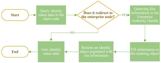 For the resolution process of the identification data, Chaincode first uses the getState method of the “ChaincodeStub” interface to obtain the identification state data and then determines whether its state needs to be redirected to the enterprise nodes, and if it does, it calls “getState” again to query the information in the enterprise authority Handle. Finally, the data are populated into the “uhdsite” field of the business identity object entity and returned.