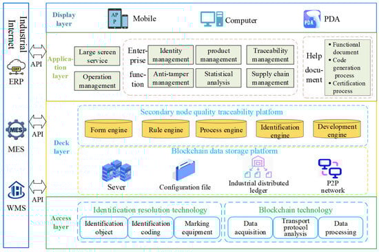 The main function of the access layer is to collect data through active marking and passive marking. The active marking mainly contains the ICC (integrated circuit card), chip, communication module, and various induction devices, and the passive marking has barcode, QR code, and so on. The traceability system introduces the enterprise’s IIoT system, Manufacturing Execution System (MES), Warehouse Management System (WMS), and Enterprise Resource Planning (ERP) system through the interface, and utilizes the blockchain database information sharing to realize the collection of quality information data and the formation of transaction records to be deposited in the blockchain ledger, which ensures the safe access, transmission, and reading of data in case of the terminal equipment being maliciously attacked.