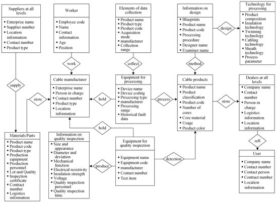 Constructing the model from the demand of analyzing and decision making and determining the corresponding core quality data of wire and cable products according to the type of identified objects can well guide the development of the IIoT and the establishment of data resources for cataloging, archiving, library building, sharing, exchange and querying [26,27]. Figure 9 is the corresponding core quality data model for cables proposed according to relevant standards.